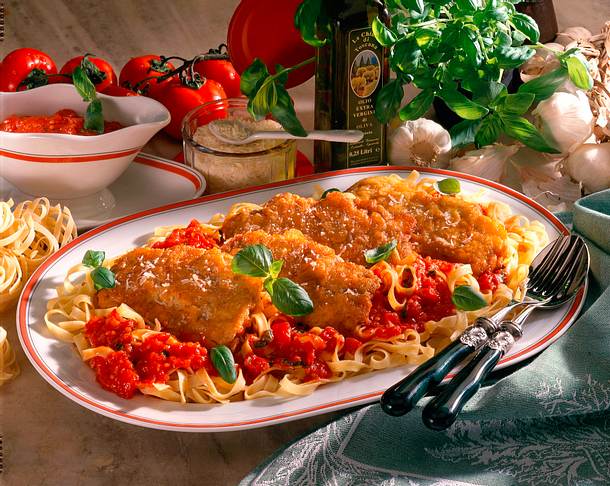 Schnitzel Uberbacken Mit Spaghetti Und Tomatensauce